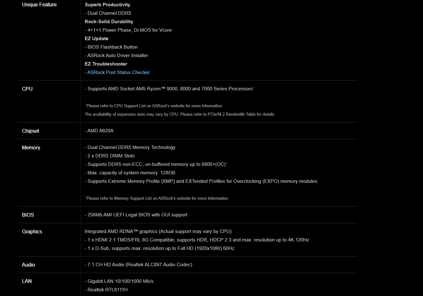 ASROCK A620AM-HVS  AMD A620 DDR5 MOTHERBOARD (3 YEARS WARRANTY BY TECH DYNAMIC PTE LTD)