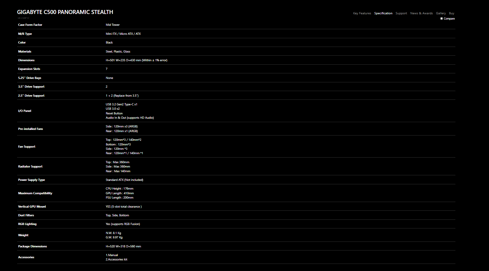 GIGABYTE C500 PANORAMIC STEALTH BLACK MID TOWER CASING (1 YEAR WARRANTY BY CDL TRADING PTE LTD)