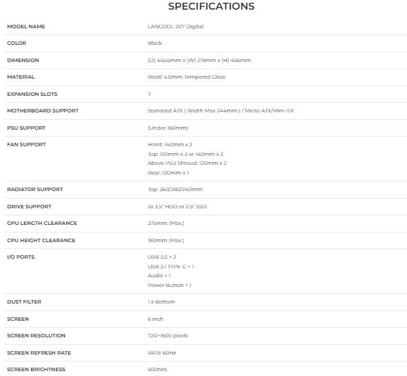 LIAN LI LANCOOL 207 DIGITAL BLACK TEMPERED GLASS M-ATX CHASSIS (1 YEARS WARRANTY BY CORBELL TECHNOLOGY PTE LTD)