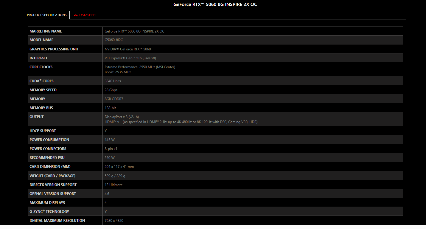MSI GeForce RTX 5060 8GB INSPIRE 2X OC EDITION GDDR7 GRAPHICS CARD (3 YEARS WARRANTY BY CORBELL TECHNOLOGIES PTE LTD)