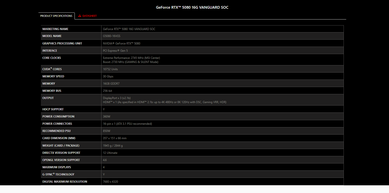 MSI VANGUARD SOC EDITION RTX 5080 RTX5080 16GB GDDR7 GRAPHICS CARD (3 YEARS WARRANTY BY CORBELL TECHNOLOGIES PTE LTD)