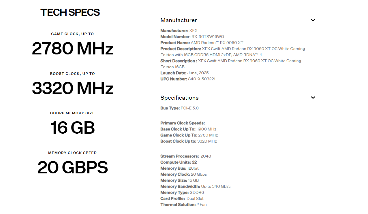 XFX SWIFT AMD RADEON RX 9060 XT 9060XT OC GAMING EDITION BK/WH 16GB GDDR6 (2 YEARS WARRANTY BY CORBELL TECHNOLOGIES PTE LTD)